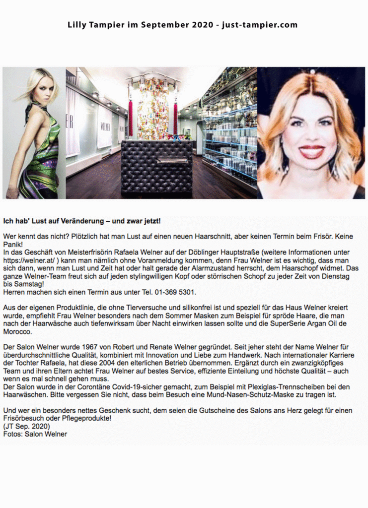 Lilly Tampier im September 2020 Post author:salon welner Post published:September 28, 2020 Post category:Presse Pressebeitrag2023 Lilly Tampier im September 2020 Döblinger Hauptstraße 4, 1190 Wien www.welner.at +43 1 369 5300 You Might Also Like Mit einem Bob kann nichts schief gehen April 2, 2015 Krone bunt März 2015 März 17, 2015 News November 2014 November 10, 2014